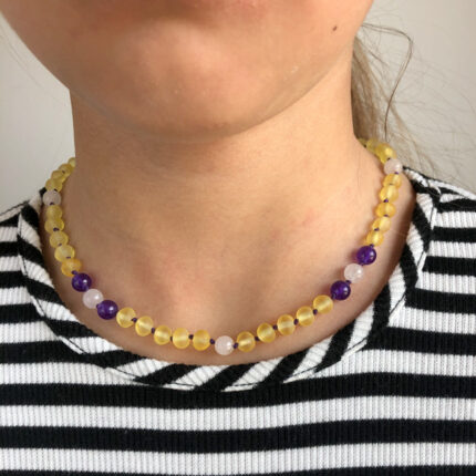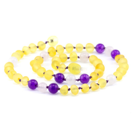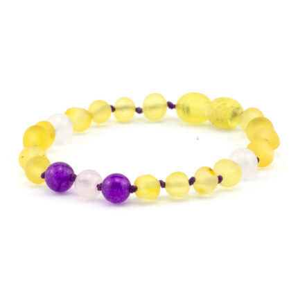 Brățară copii din chihlimbar galben mat, ametist & cuarț alb – Echilibru și Nopți Liniștite