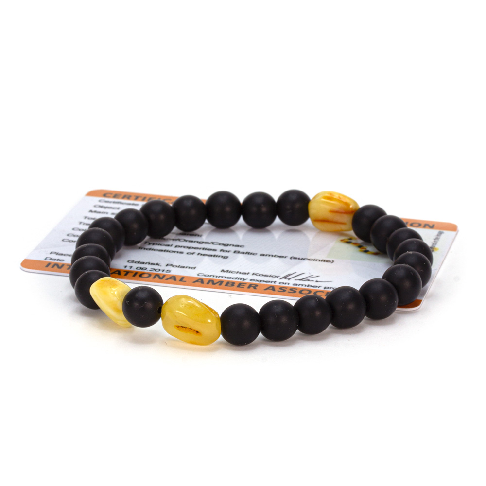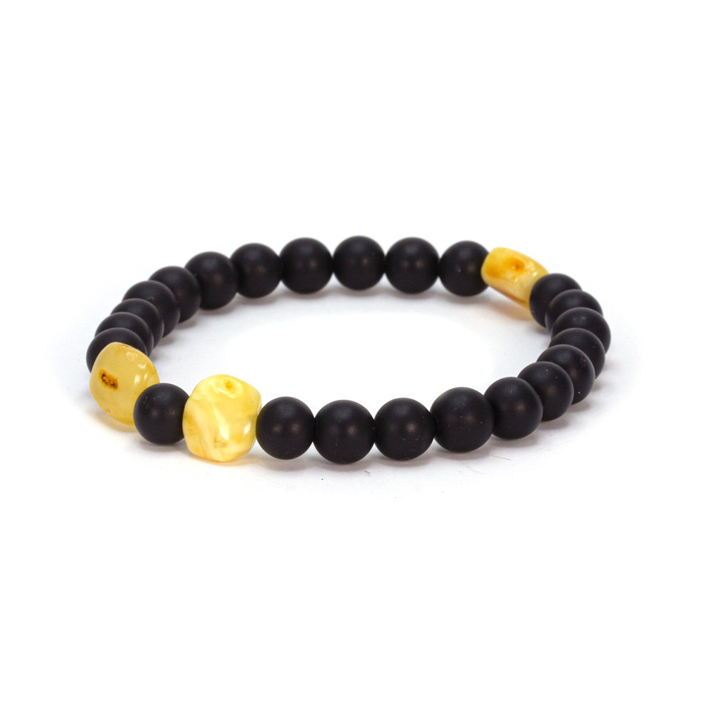 Elegantă și masculină, această brățară pentru bărbați combină mărgele ovale din chihlimbar alb cu sfere de onix negru, de 8 mm. Flexibilă datorită sistemului de închidere elastic, aceasta se adaptează oricărei încheieturi, adăugând o notă sofisticată ținutei tale zilnice.