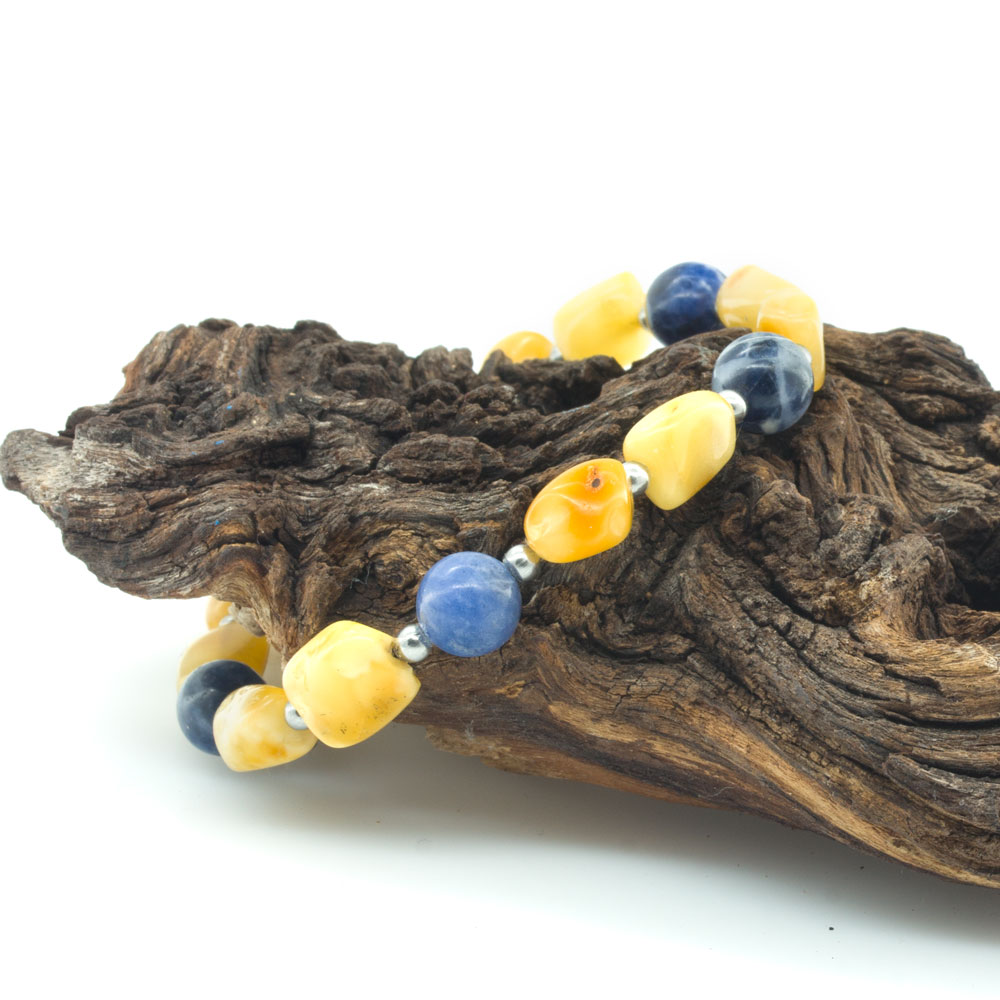 Colecție 2025: Brățară Sodalit & chihlimbar, realizată manual, compusă din pietre de chihlimbar natural galben/unt de diferite mărimi și forme separate de bile din inox decorată cu mărgele din sodalit.