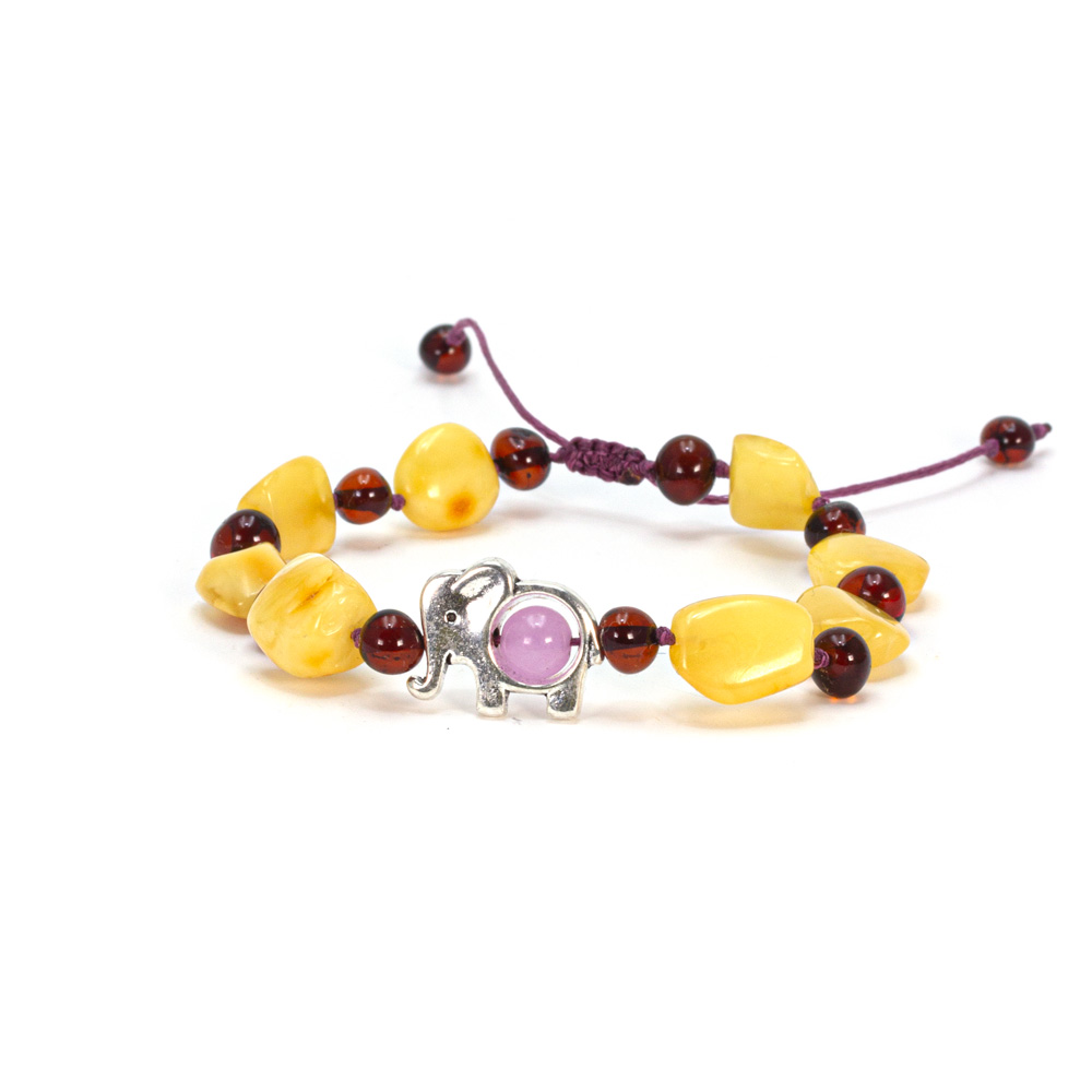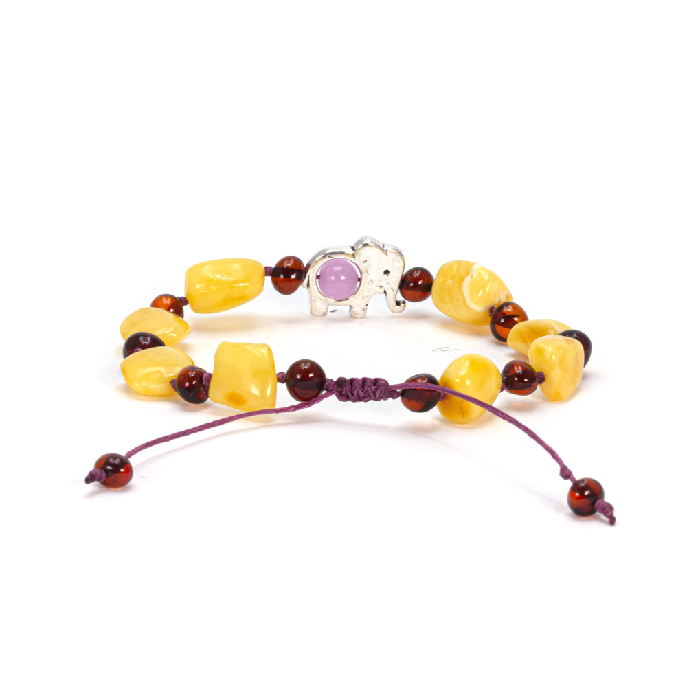 Brățară din chihlimbar în culori coniac și unt, cu charm în formă de elefant și piatra zilei de naștere. Un accesoriu unic, perfect pentru a adăuga un strop de culoare și semnificație personală la orice ținută.