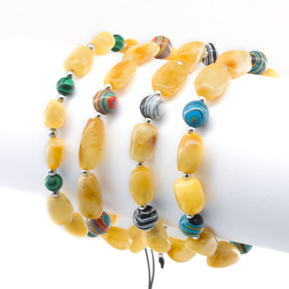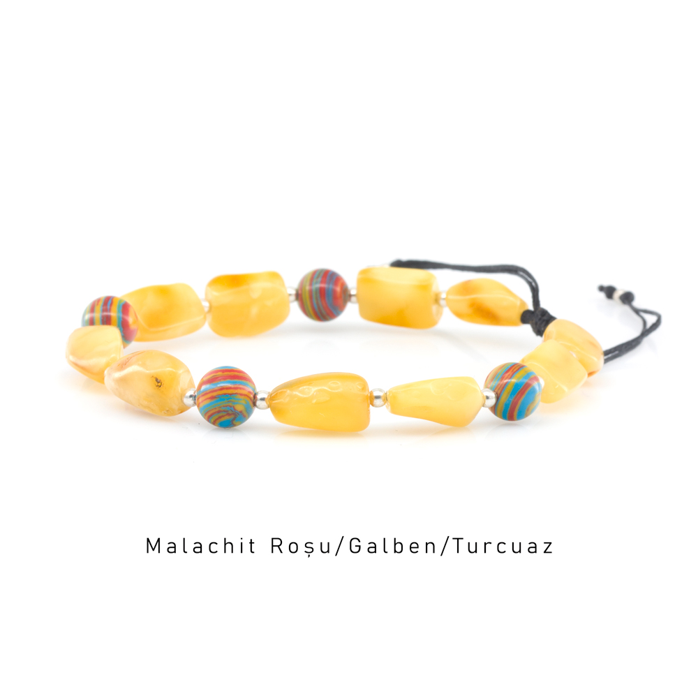Brățară serie limitată din chihlimbar natural & malachit multicolor, realizată manual, compusă din pietre de chihlimbar natural galben/unt de diferite mărimi și forme separate de bile din inox și sfere din malachit multicolor.