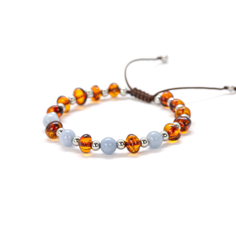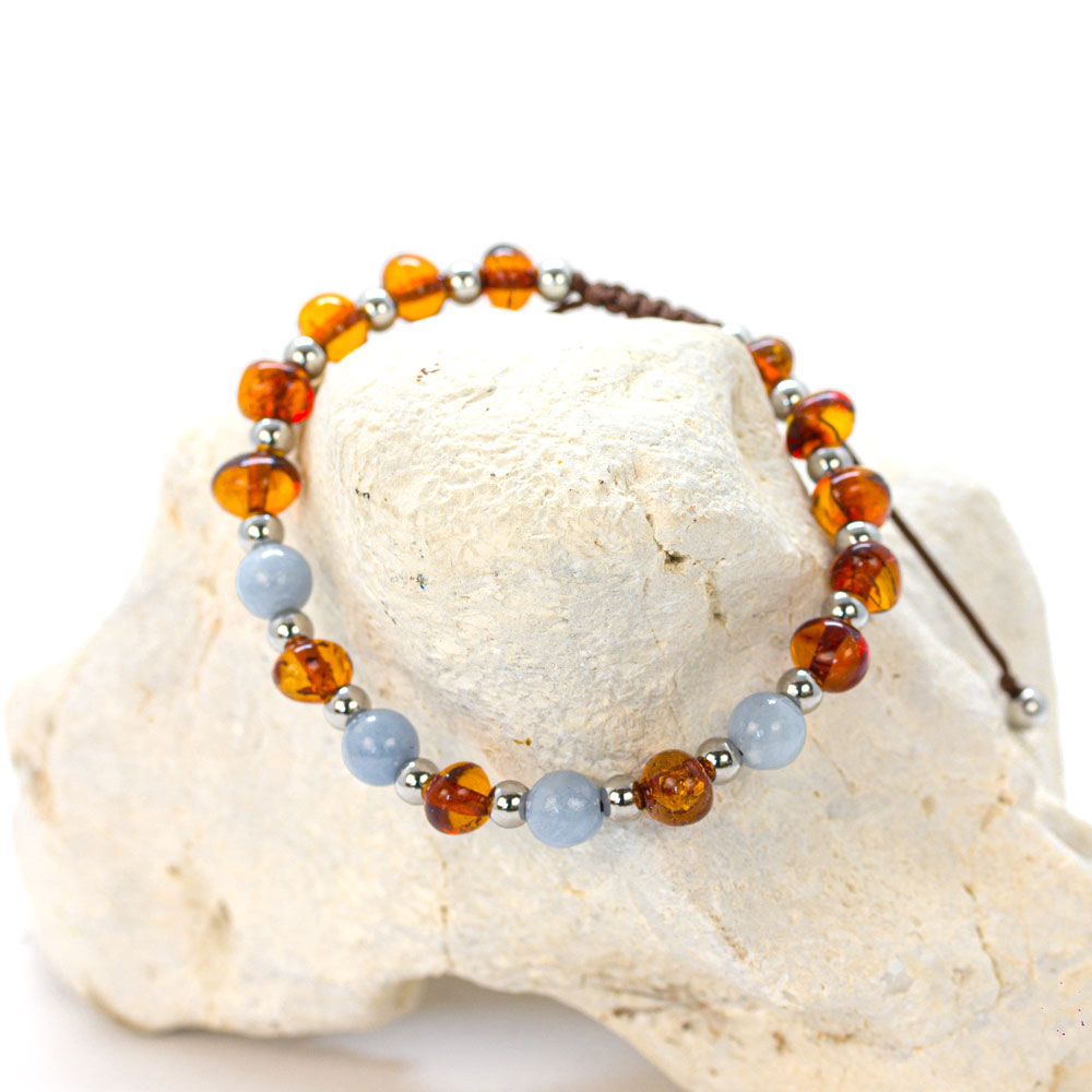 Brățară pentru liniște și comunicare blândă, cu angelit și chihlimbar baltic asociat tradițional cu confortul natural. Pentru zile vesele și nopți liniștite.