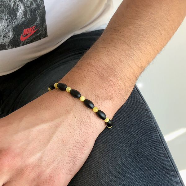 Chihlimbarul baltic galben este apreciat tradițional pentru energia sa caldă și pentru asocierea cu susținerea confortului fizic și a mobilității zilnice. În combinație cu onixul piatră a forței și stabilității – această brățară devine un accesoriu masculin cu semnificație profundă.