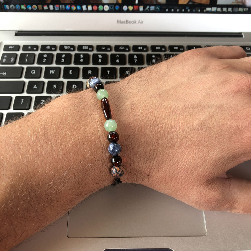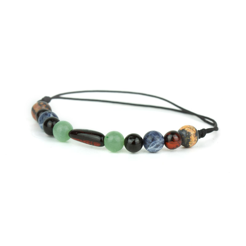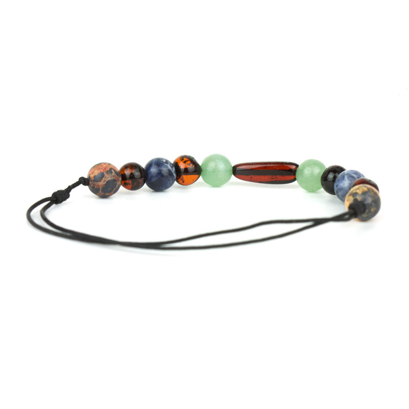 Brățară realizată din mărgele semirotunde de chihlimbar baltic negru-cireș și pietre semiprețioase (aventurin, sodalit și jasp leopard skin. Dimensiuni pietre: chihlimbar semirotund 8mm, chihlimbar oval(centru) 1.9×7 mm, pietre semiprețioase 8 mm. Sistemul de închidere este reglabil cu șnur culisant. Mai multe informații despre proprietățile terapeutice ale chihlimbar-ului precum și ghidul de mărimi veți găsi în partea inferioară a paginii. Realizăm la comandă orice model de brățară din chihlimbar cu sau fara pietre semiprețioase.