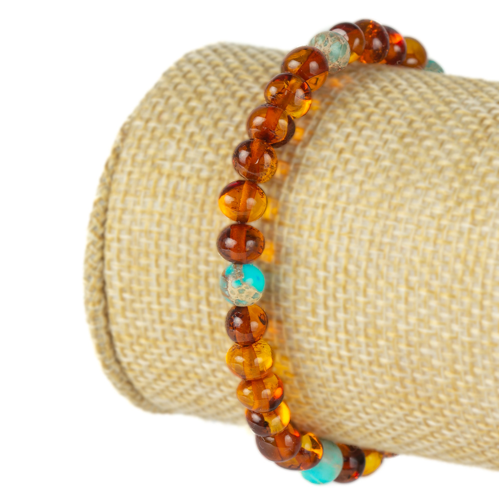 - Brățară realizată din mărgele semirotunde din chihlimbar baltic culoare maro, nuanță coniac și sfere jasp imperial turcuaz.
