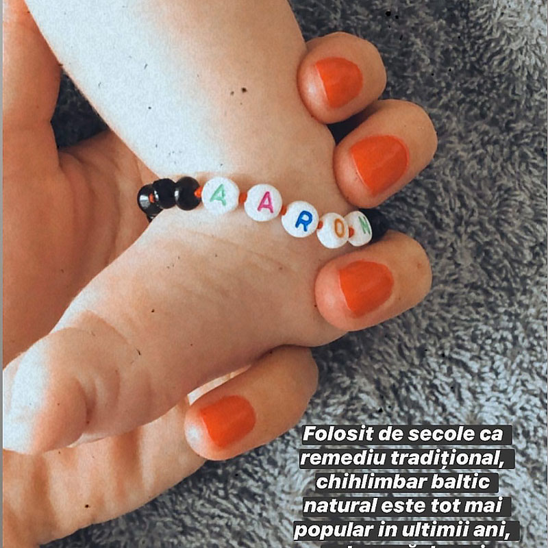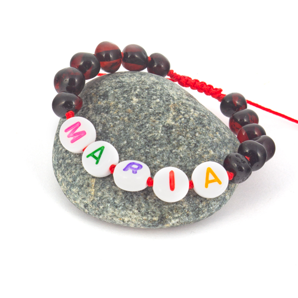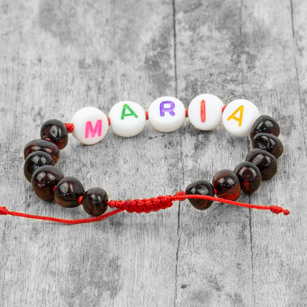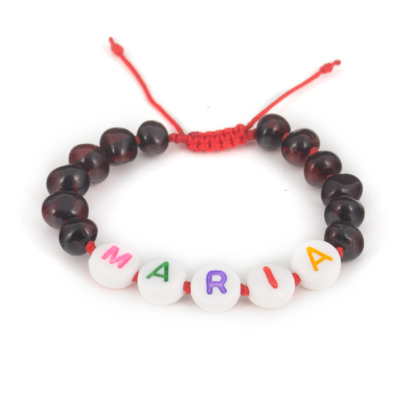 Fiecare brățară este realizată la comandă cu numele copilului tău însirat printre mărgelele de chihlimbar cireș. Literele multicolore pe fondul întunecat al cireșului creează un contrast vibrant și deosebit — numele se vede imediat și frumos, transformând brățara într-un cadou cu totul special.