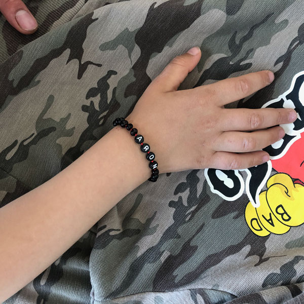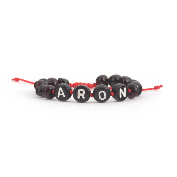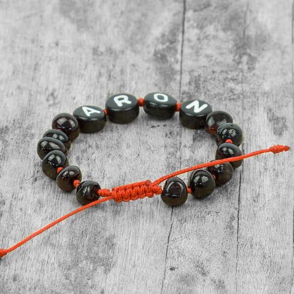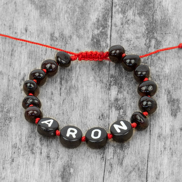 Fiecare brățară este realizată la comandă cu numele copilului tău însirat printre mărgelele de chihlimbar negru. Literele albe pe fondul închis al chihlimbarului negru și șnurul roșu creează un contrast puternic și vizibil — numele se citește clar și frumos, transformând brățara într-un accesoriu unic și memorabil.