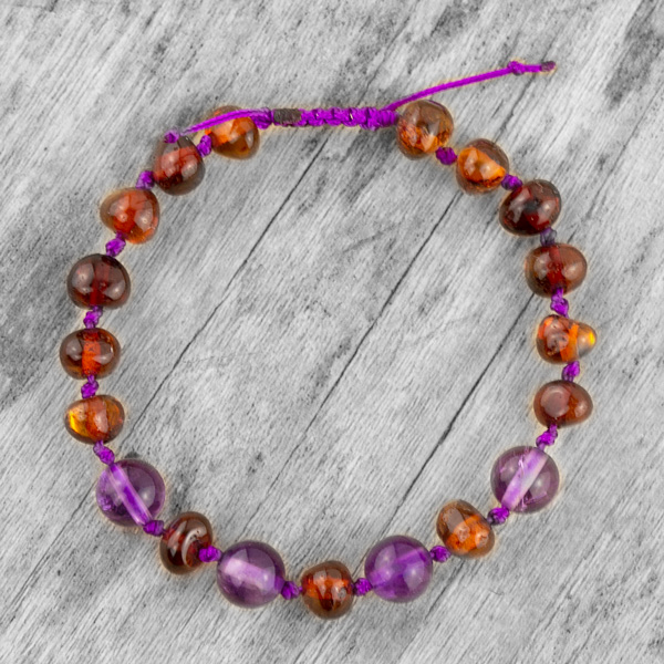 Brățară pentru copii realizată din chihlimbar baltic maro autentic și ametist natural, o combinație blândă și caldă, apreciată pentru liniște emoțională, calm și somn odihnitor.