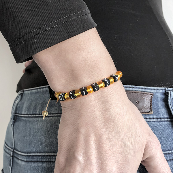 Brățară realizată dintr-o combinație de pietre semirotunde din chihlimbar baltic galben-miere și cuburi negre cu litere. Textura chihlimbarului poate fi mată sau lucioasă în funcție de preferințele dvs. Sistemul de închidere al brățării este reglabil cu nod culisant. Mai multe informații despre proprietățile terapeutice ale chihlimbar-ului precum și ghidul de mărimi veți găsi în partea inferioară a paginii. Realizăm la comandă orice model de brățară din chihlimbar cu sau fara pietre semiprețioase. Garanție pe viață pentru sistemul de închidere și șnur.