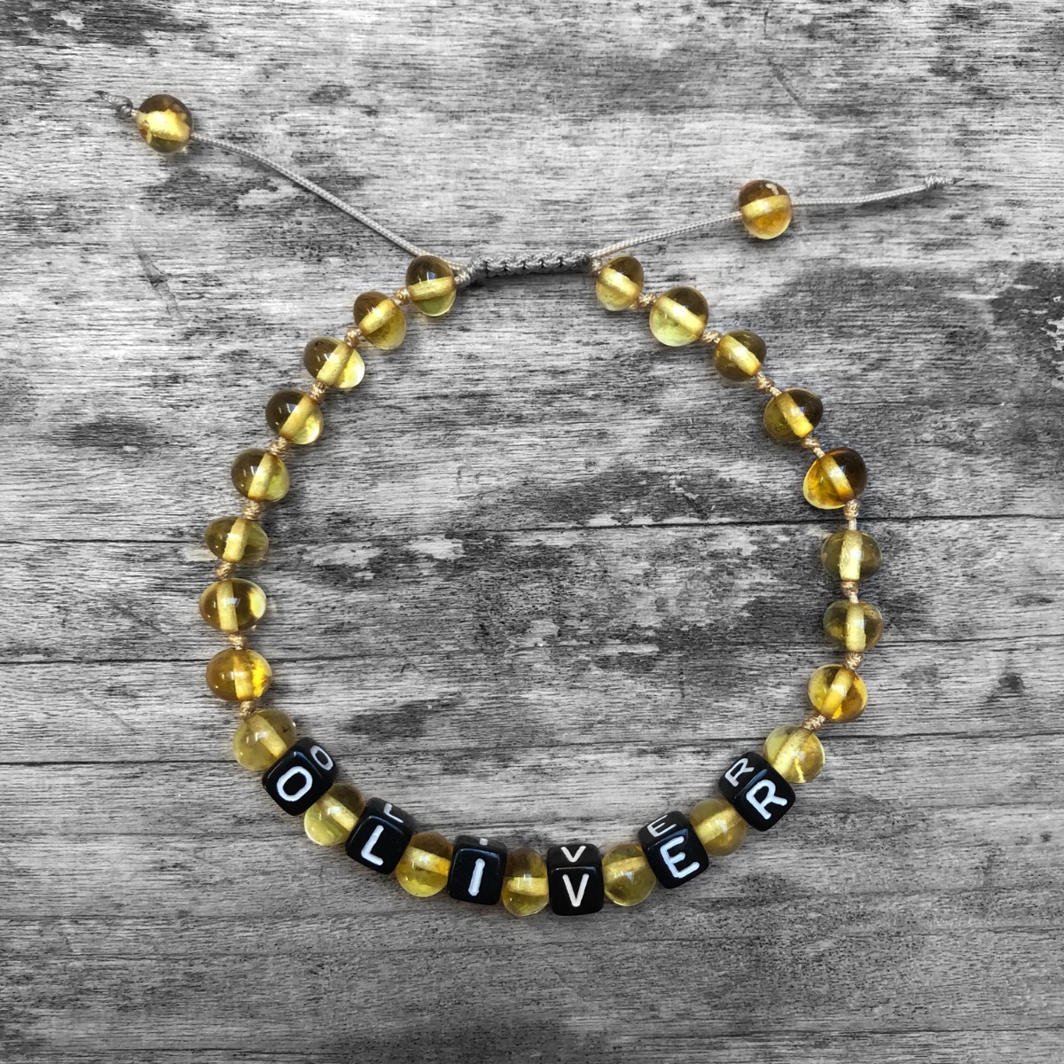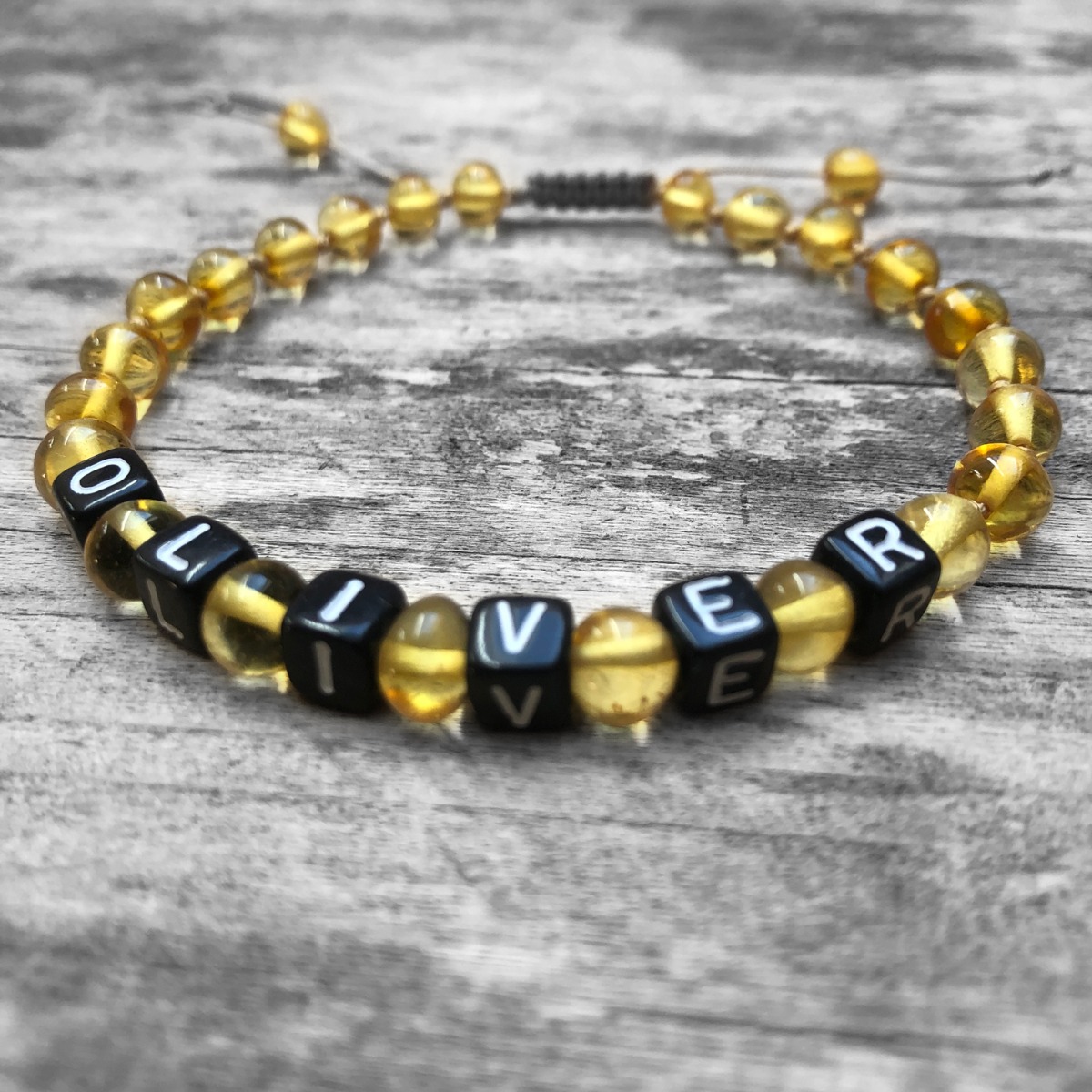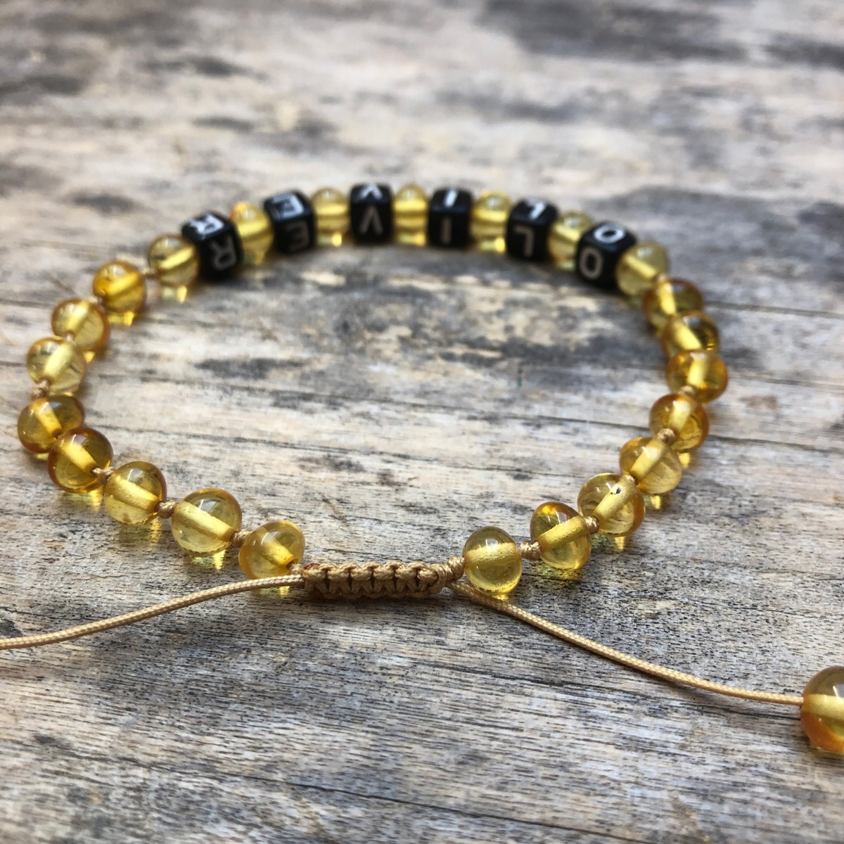 Brățară reglabilă din chihlimbar baltic galben personalizată cu numele copilului