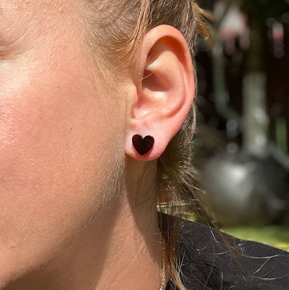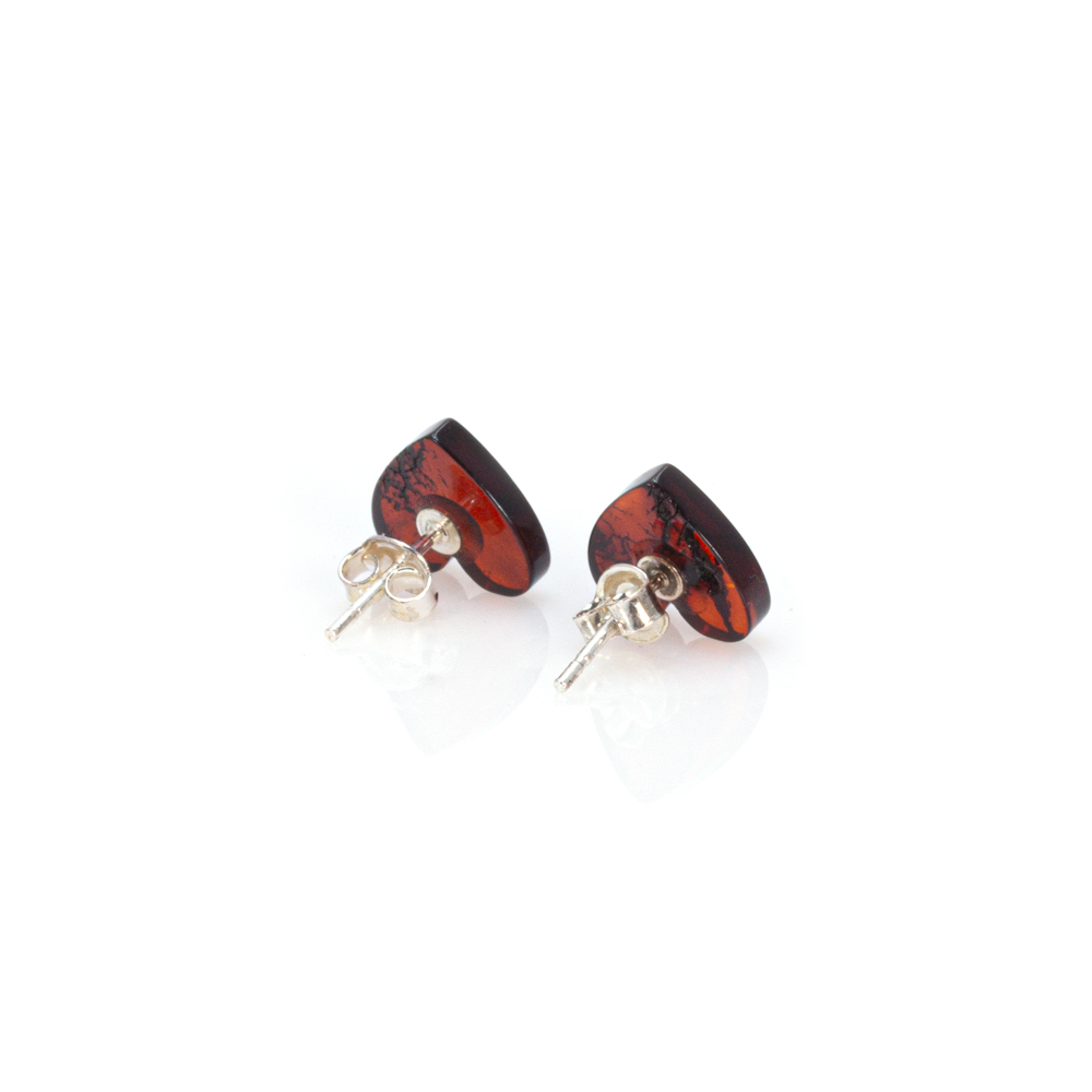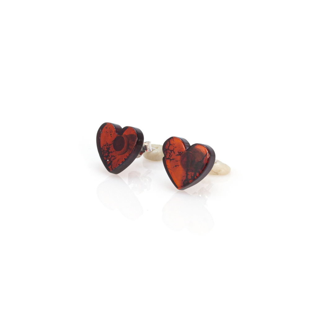 Pereche cercei din chihlimbar natural culoare negru, nuanță cireș, forma de inimă cu închidere fluturaș din argint 925.