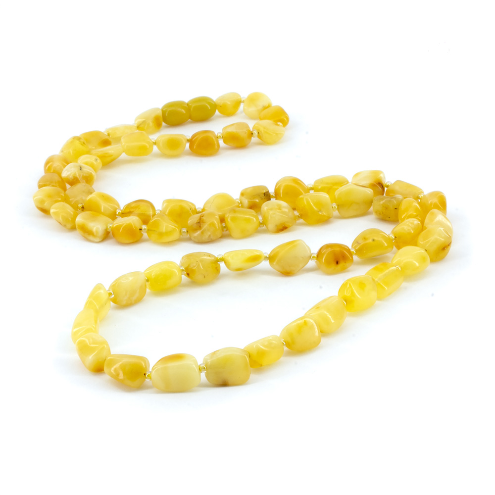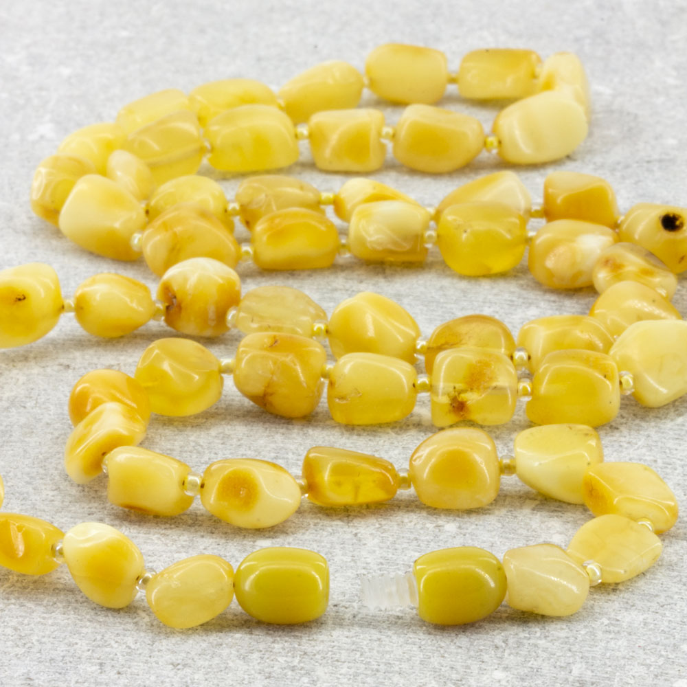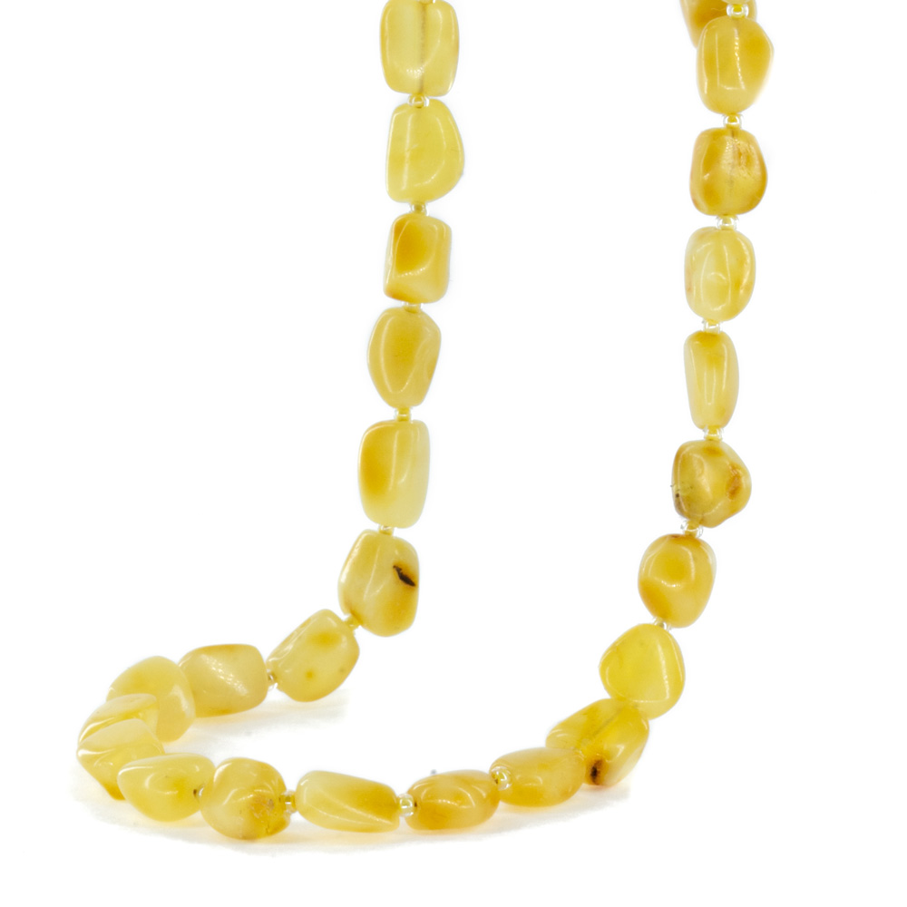 Colier chihlimbar baltic natural cu textură și culori unice. Mărgelele galbene de culoarea unt-ului te vor pune într-o bună dispoziție zi de zi și te va face să simți că soarele strălucește asupra ta. Piese ovale neregulate șlefuite lucios sunt înșirate pe fir de mătase iar sistemul de închidere este din acril (antialergic) cu șurub. Colierul poate fi personalizat cu pietre semipretioase, așa că dacă ești o fire creativa, simte-te liberă și crează-ți propriul model combinând orice pietre disponibile în magazin.