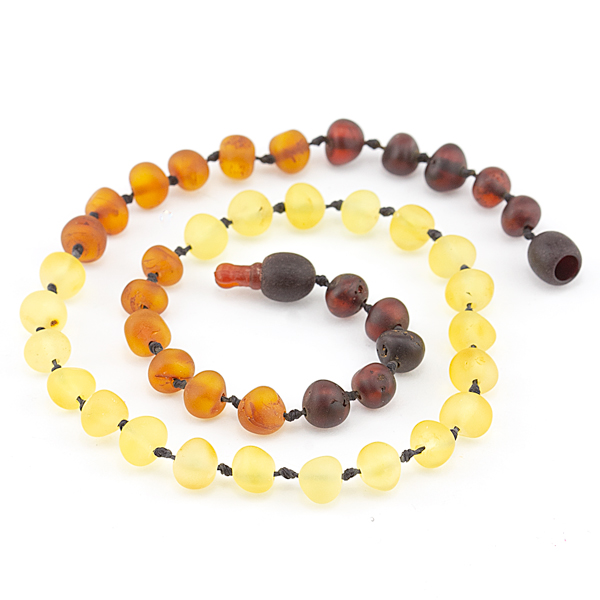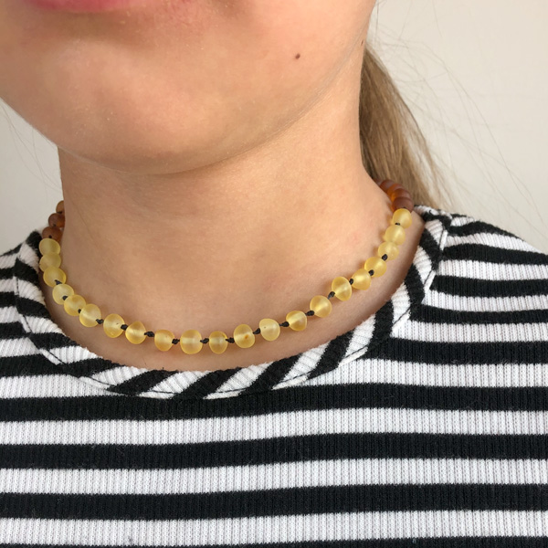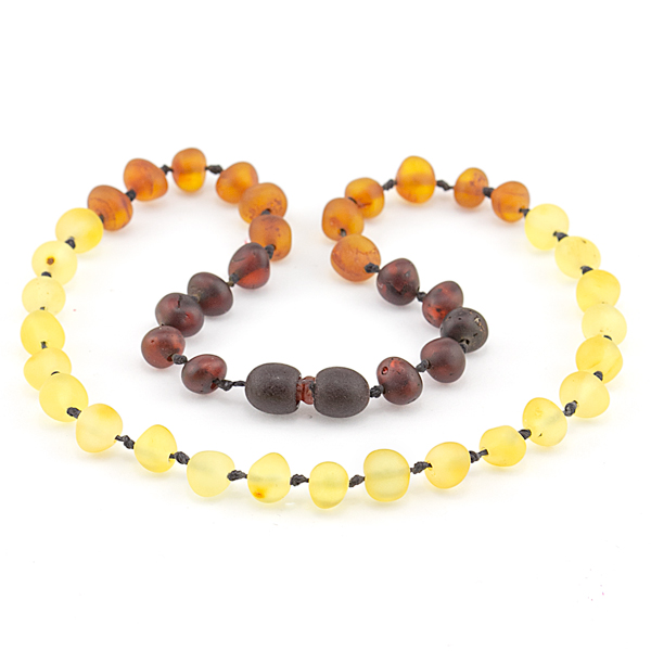 Colier chihlimbar copii realizat din pietre mate semirotunde galbene, maro și negre înșirate în degrade și înnodate alternativ pe șnur din mătase. Calibrul pietrelor este de 4-6 mm. Sistemul de închidere al colierului este pop-up pentru copii până în 6 ani și cu șurub pentru 6+. Garanție pe viață pentru sistemul de închidere și șnur. Mai multe informații despre proprietățile terapeutice ale chihlimbar-ului precum și ghidul de mărimi veți găsi în partea inferioară a paginii.
