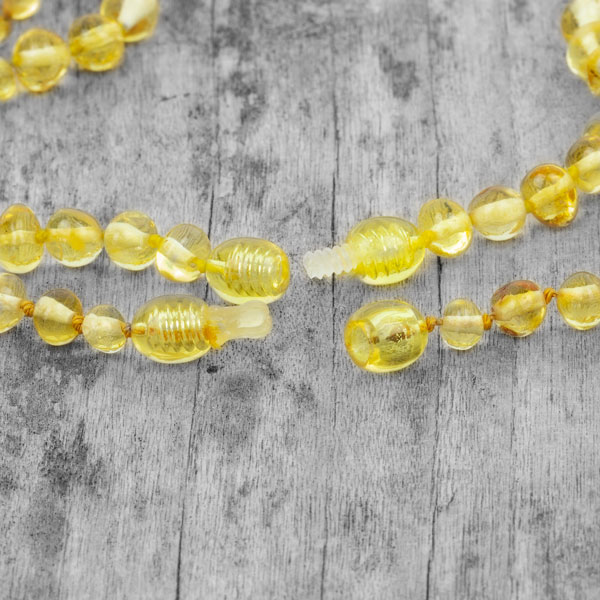 Un colier chihlimbar copii este conceput si realizat special pentru copii respectand legislatia Uniunii Europene astfel: Fiecare margeluta este innodata individual astfel incat, daca colierul se rupe margelele nu se vor imprastia. Sistemul de inchidere al unui colier chihlimbar copii este realizat din plastic special pentru a nu da alergii precum cele din metal. Inchizatoarea colierului pentru copii de pana in 3 ani este de tip „pop-up” si se deschide automat daca este agatat sau tras cu o tensiunde de peste 6.8 kg/f. Recomandam supravegherea copiilor sub 3 ani in timpul purtarii unui colier chihlimbar copii si mutarea colierului infasurat de doua ori la gezna piciorului in timpul orelor de somn.