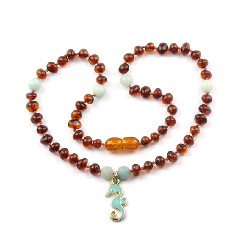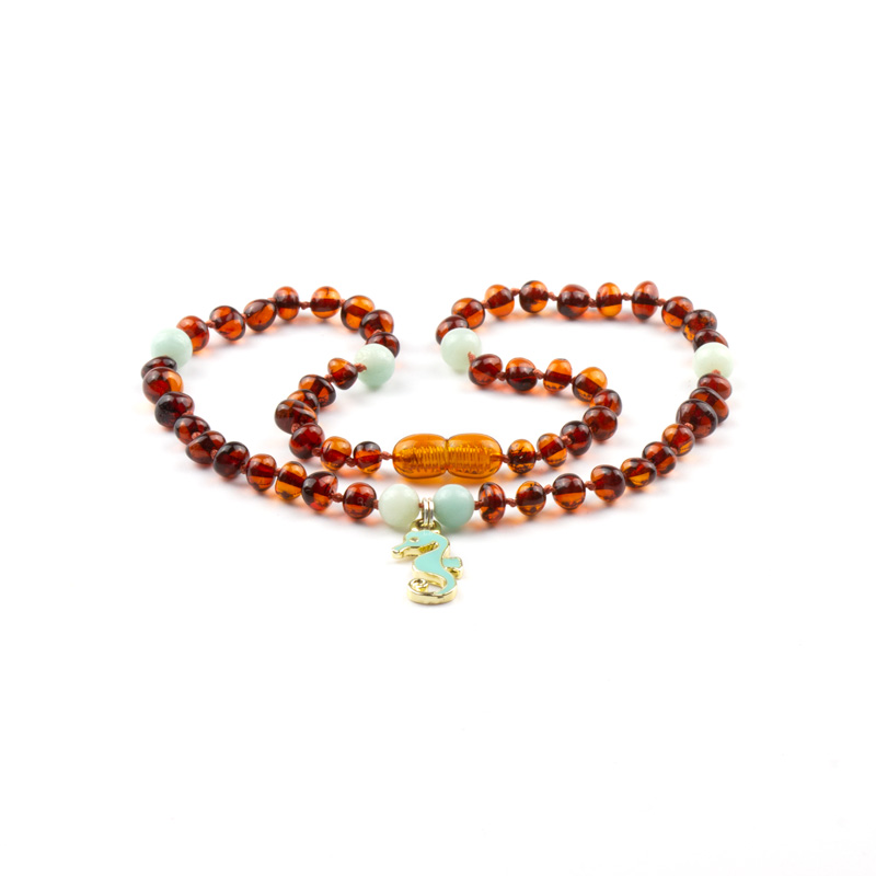 Colier copii – chihlimbar baltic & acvamarin – căluț de mare