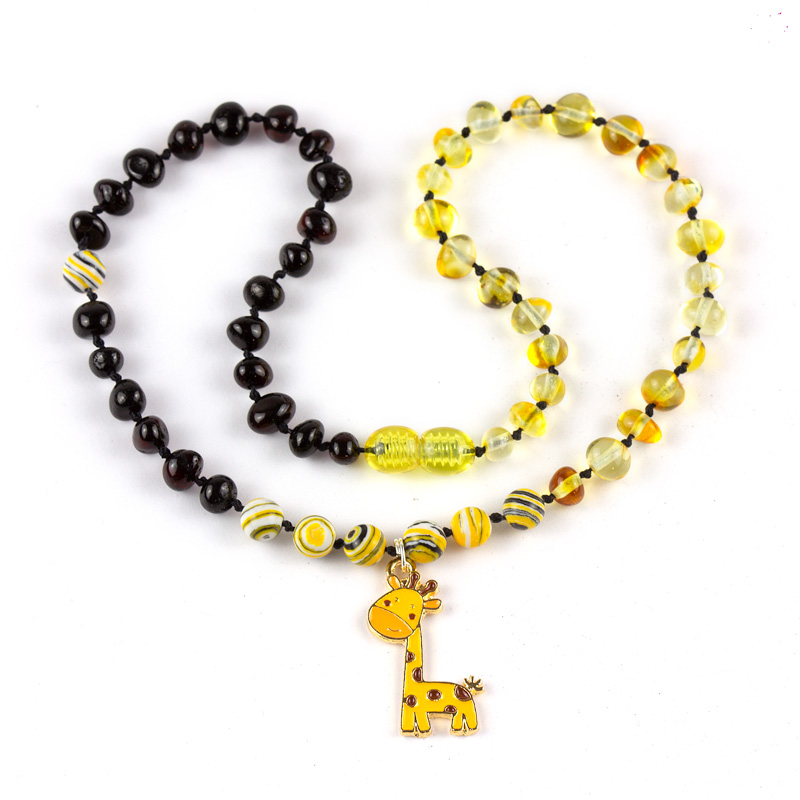 Colier copii chihlimbar baltic negru și galben & malachit & pandantiv girafă