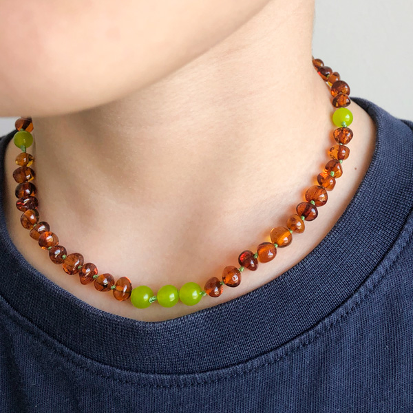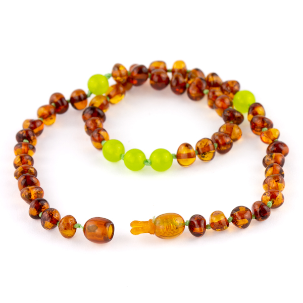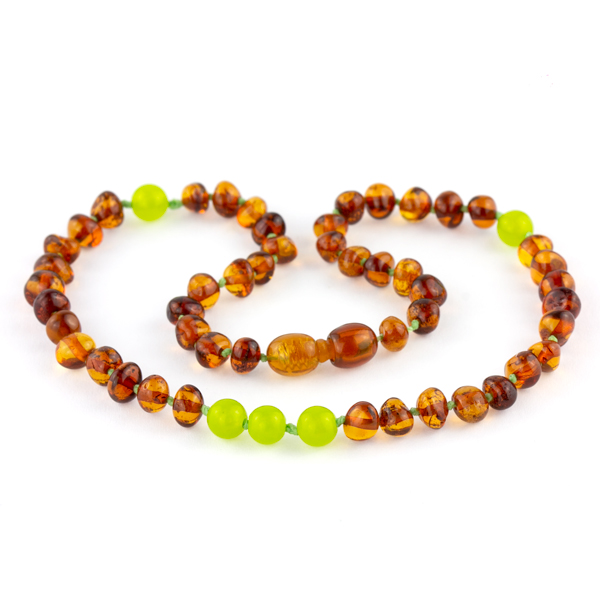 Colier chihlimbar copii realizat din pietre semirotunde culoare maro, nuanță coniac si jad verde. Fiecare piatră este înnodată separat pe șnur verde. Sistemul de închidere al colierului este pop-up pentru copii până în 6 ani și cu șurub pentru 6+. Garanție pe viață pentru sistemul de închidere și șnur. Mai multe informații despre proprietățile terapeutice ale chihlimbar-ului precum și ghidul de mărimi veți găsi în partea inferioară a paginii.