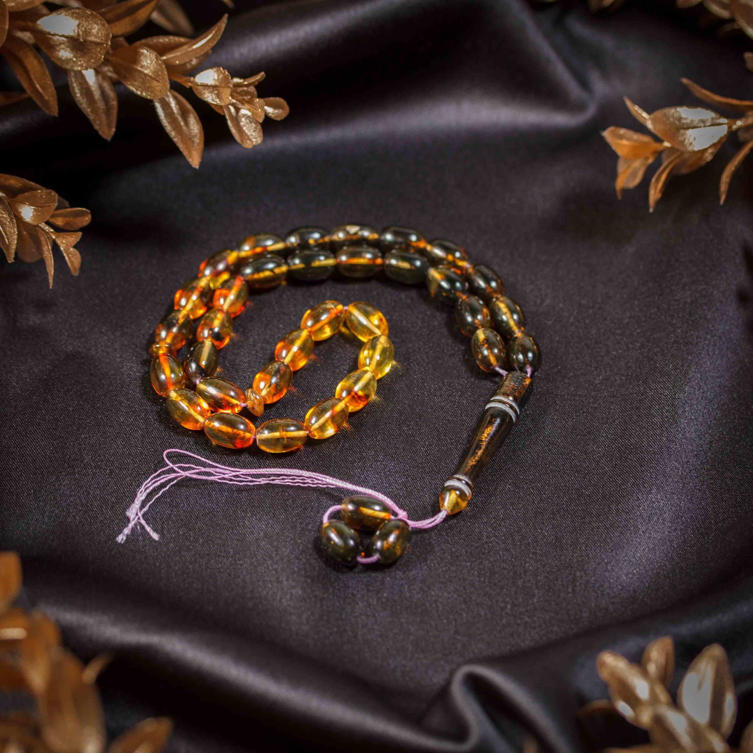 Mătănii realizate manual din chihlimbar baltic autentic multicolor, cu 33 de boabe ovale dispuse în degrade — o piesă unicat, unică prin combinația naturală de culori.