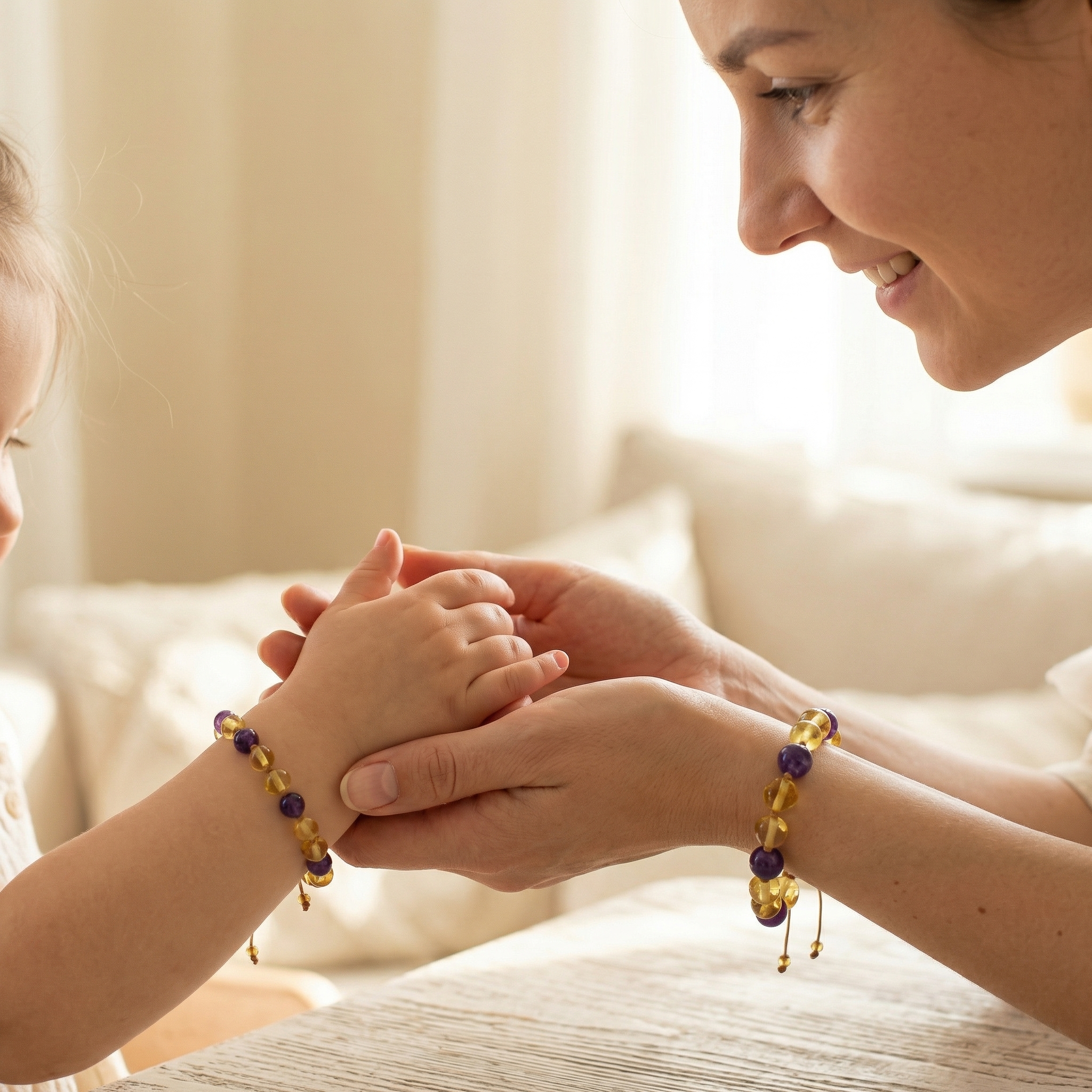 Pentru mămici — chihlimbarul baltic acționează ca antiinflamator natural, reducând oboseala și durerile acumulate. Ametistul este asociat cu reducerea stresului, somnul odihnitor și echilibrul sistemului nervos.