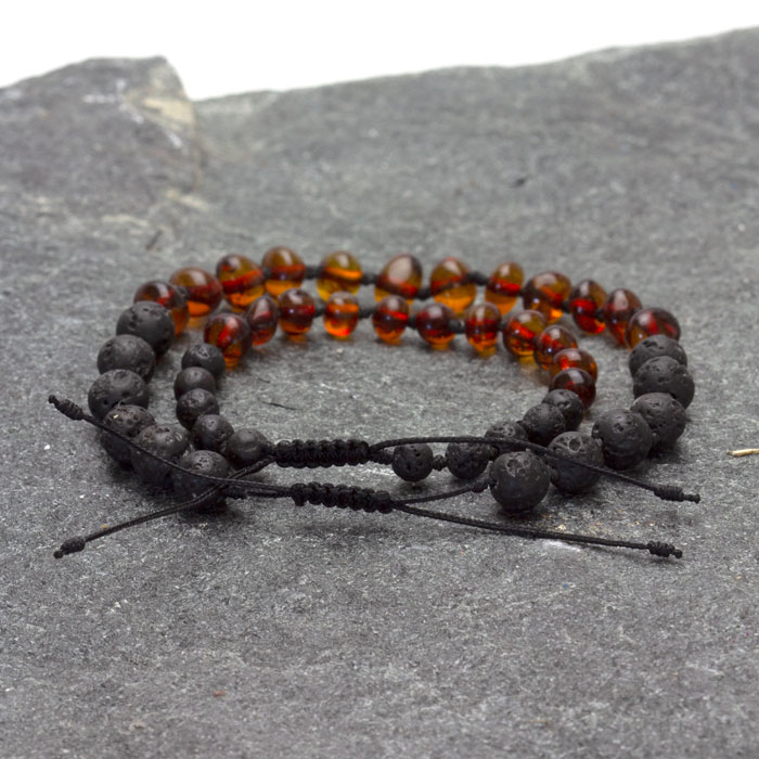 - set brățări din chihlimbar baltic maro și pietre din lavă vulcanică;
