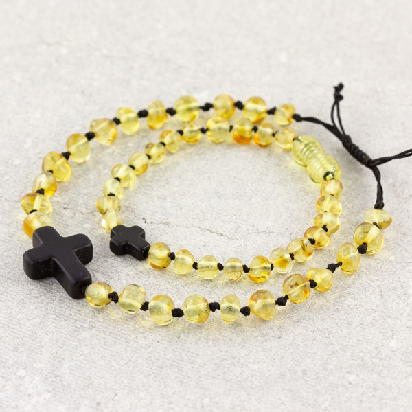 Acest set reunește chihlimbarul baltic autentic galben-miere cu o elegantă cruciuliță neagră — o combinație caldă și luminoasă, gândită pentru familiile care prețuiesc deopotrivă naturalețea și credința.