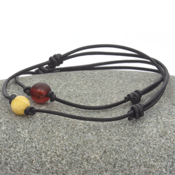 Set compus din 2 brățări cu șnur din piele și mărgele semirotunde/rotunde din chihlimbar baltic negru, nuanță cireș și galben nuanță unt, calibrul de 7-8 mm. Culorile, nuanța și forma pietrelor din chihlimbar pot diferi de la un produs la altul. Mai multe informații despre proprietățile terapeutice ale chihlimbarului veți găsi în partea inferioară a paginii.