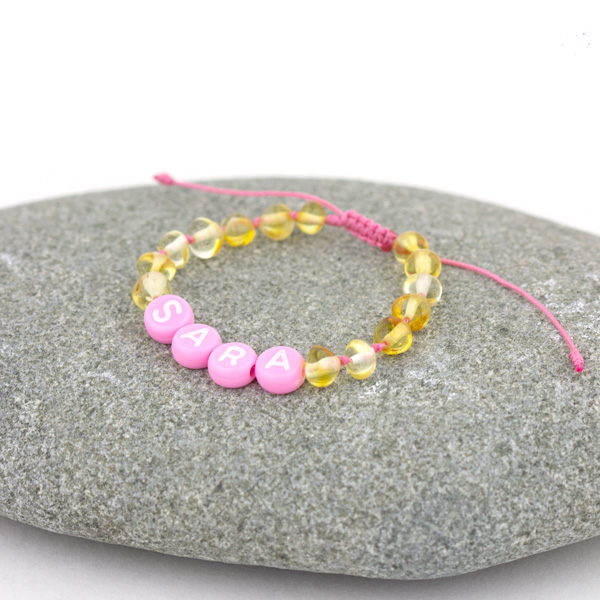 - literele pentru brățara de copil sunt din acril roz și sunt în formă de rotund plat;