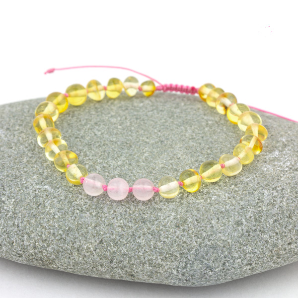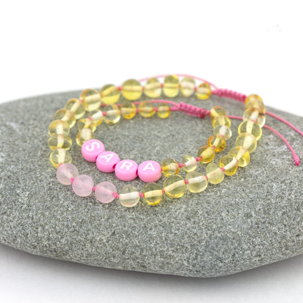 Set brățări familie din chihlimbar baltic galben personalizate cu nume și quartz roz