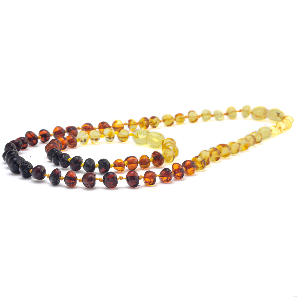 Setul compus dintr-un colier și o brățară realizate din mărgele semirotunde de chihlimbar baltic galben, maro și negru înnodate în degrade pe șnur, calibrul 4-6 mm, finisare lucioasă. Lungimea brățării poate fi reglabilă sau fixă în funcție de alegerea dvs. Colierele din categoriile de vârsta 0-6 ani sunt realizate cu închizători „pop-up” iar pentru categoriile +6 ani și adulți cu șurub. Atât colierele cât și brățările sunt disponibile în dimensiuni de la nou nascuți până la adult 2XL. Culoarea, nuanța și forma pietrelor din chihlimbar pot diferi de la un produs la altul. Mai multe informații despre proprietățile terapeutice ale chihlimbarului veți găsi în partea inferioară a paginii.