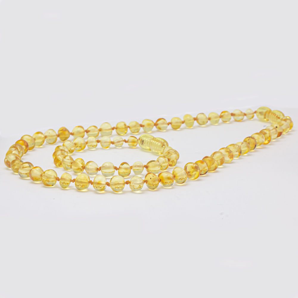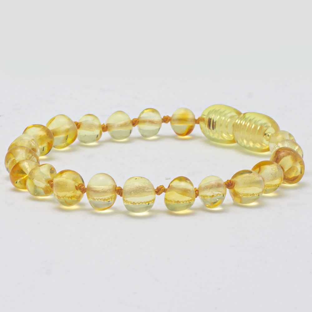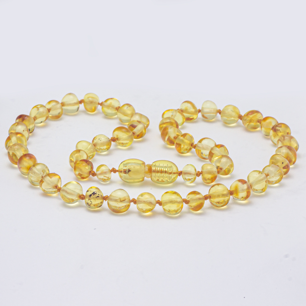 Colierele şi brăţările din chihlimbar sunt concepute şi realizate special pentru copii respectând legislaţia europeană astfel: Fiecare mărgeluţă este înnodată individual astfel încât dacă colierul sau brăţara se rupe mărgelele nu se vor imprăştia. Sistemul de închidere al bijuteriilor din chihlimbar pentru copii este realizat din plastic special pentru a nu da alergii precum cele din metal. Închizătoarile colierelor pentru copiii de până în 3 ani sunt de tip „pop-up” si se deschid automat daca sunt agăţate sau trase cu o tensiunde de peste 6.8 kg. Închizătorile brăţărilor sunt cu acţiune prin înşurubare pentru a nu putea fi desfăcute de cei mici. Recomandăm supravegherea copiilor sub 3 ani în timpul purtării bijuteriilor din chihlimbar şi mutarea colierului înfăşurat de două ori la gezna piciorului în timpul orelor de somn