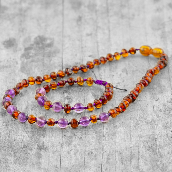 - Setul este compus dintr-un colier și o brățară realizate din mărgele semirotunde de chihlimbar baltic maro – coniac, calibrul 4-6 mm și sfere din ametist.