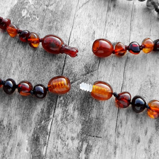Colierele şi brăţările din chihlimbar sunt concepute şi realizate special pentru copii respectând legislaţia europeană astfel: Fiecare mărgeluţă este înnodată individual astfel încât dacă colierul sau brăţara se rupe mărgelele nu se vor imprăştia. Sistemul de închidere al bijuteriilor din chihlimbar pentru copii este realizat din plastic special pentru a nu da alergii precum cele din metal. Închizătoarile colierelor pentru copiii de până în 3 ani sunt de tip „pop-up” si se deschid automat daca sunt agăţate sau trase cu o tensiunde de peste 6.8 kg. Închizătorile brăţărilor sunt cu acţiune prin înşurubare pentru a nu putea fi desfăcute de cei mici. Recomandăm supravegherea copiilor sub 3 ani în timpul purtării bijuteriilor din chihlimbar şi mutarea colierului înfăşurat de două ori la gezna piciorului în timpul orelor de somn