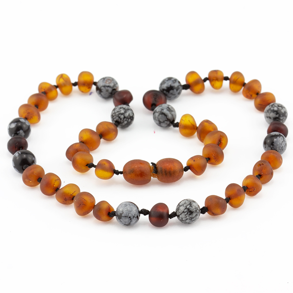 Set colier – brățară din chihlimbar baltic maro mat & obsidian fulg de nea